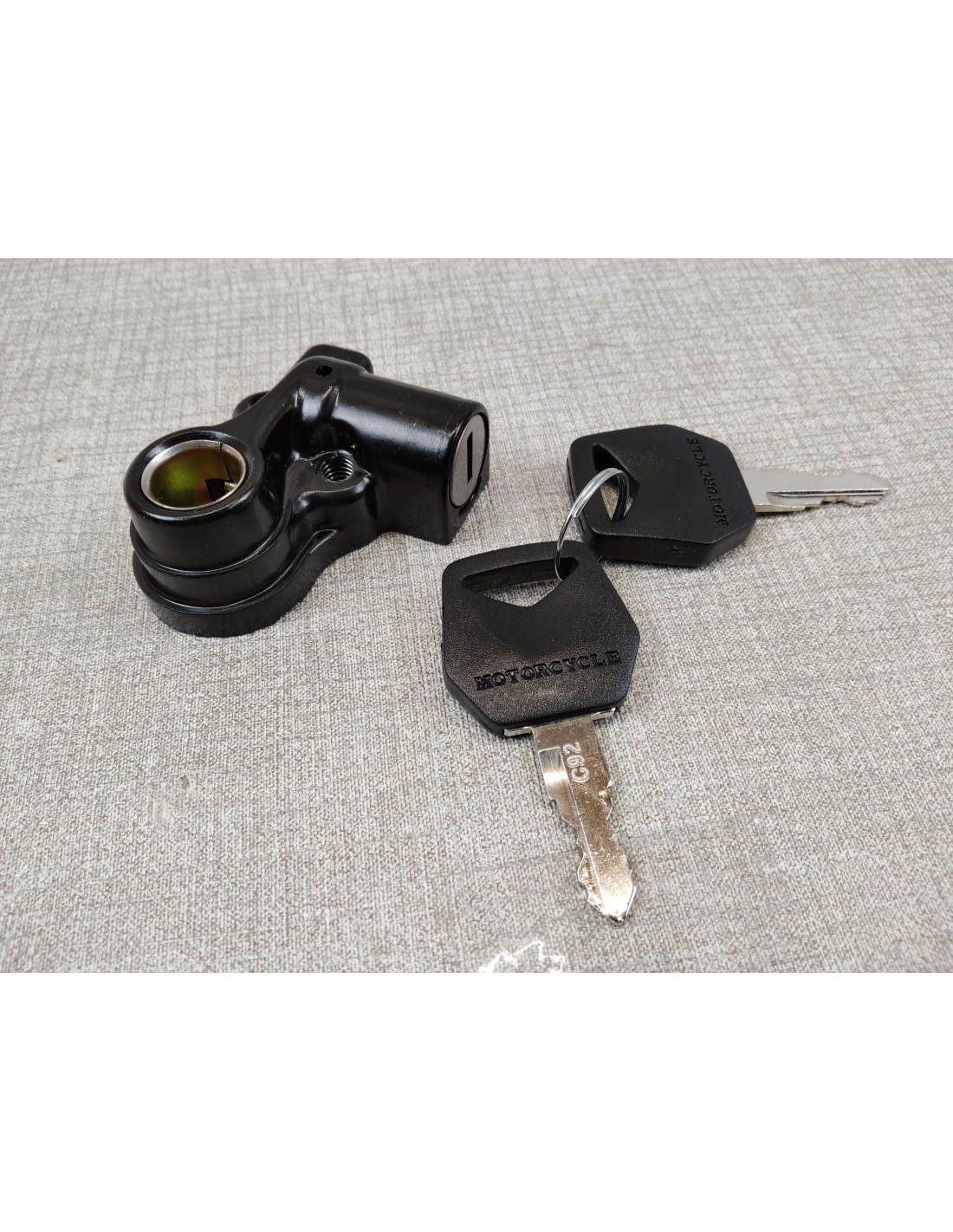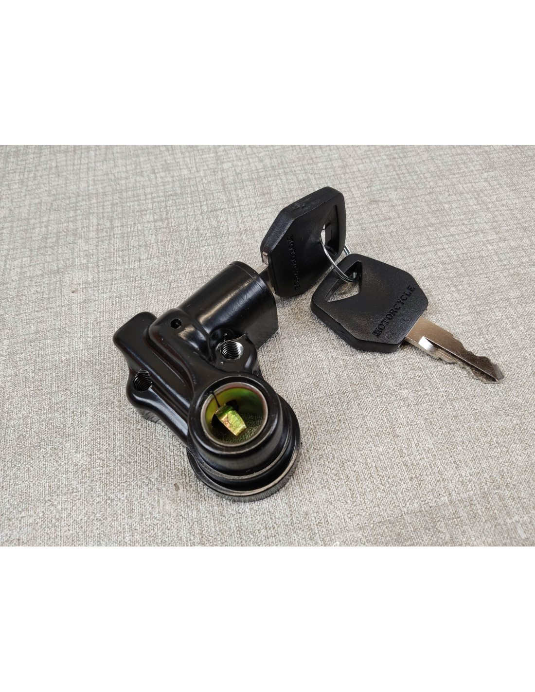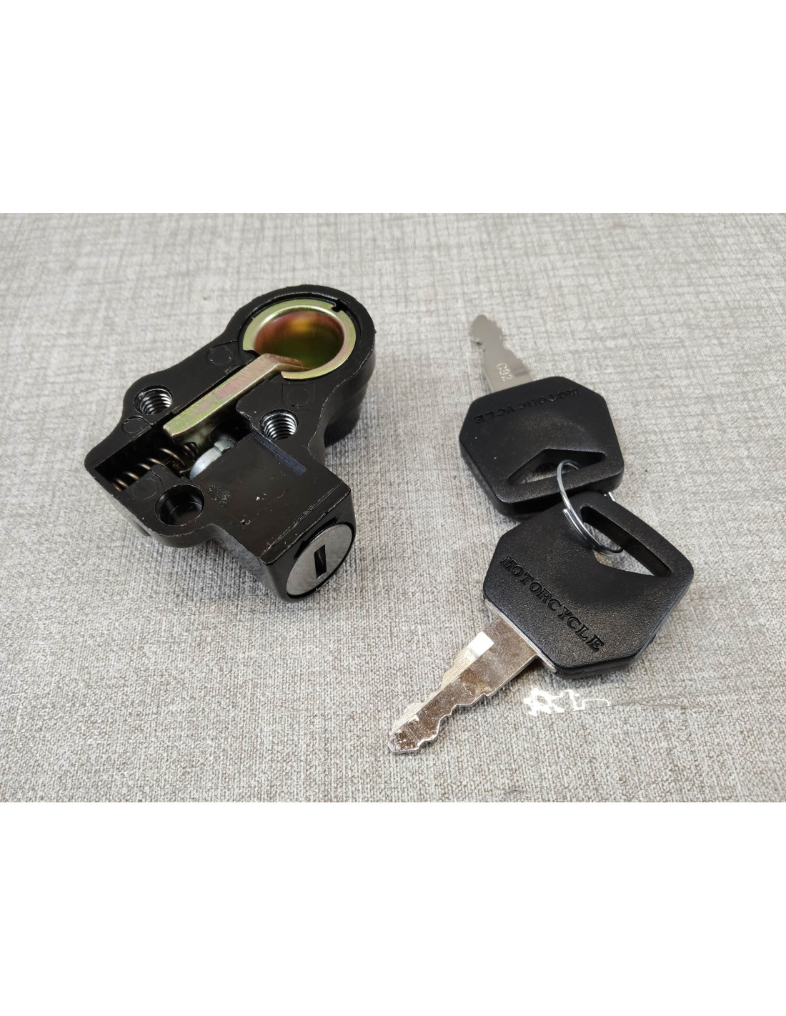Serrure de selle NEUVE avec deux clés de REFABRICATION (gravées aux numéros de la serrure) pour divers modèles , CB125JX, CB125T, CB200, CB250-350K4, CB250-360G, CB450K5, Honda Four (sauf 500K0, 750K0-K1)..........idem 77230347003, 77230107711,