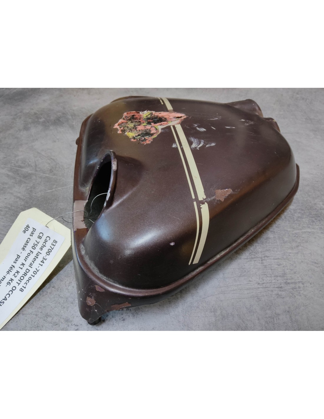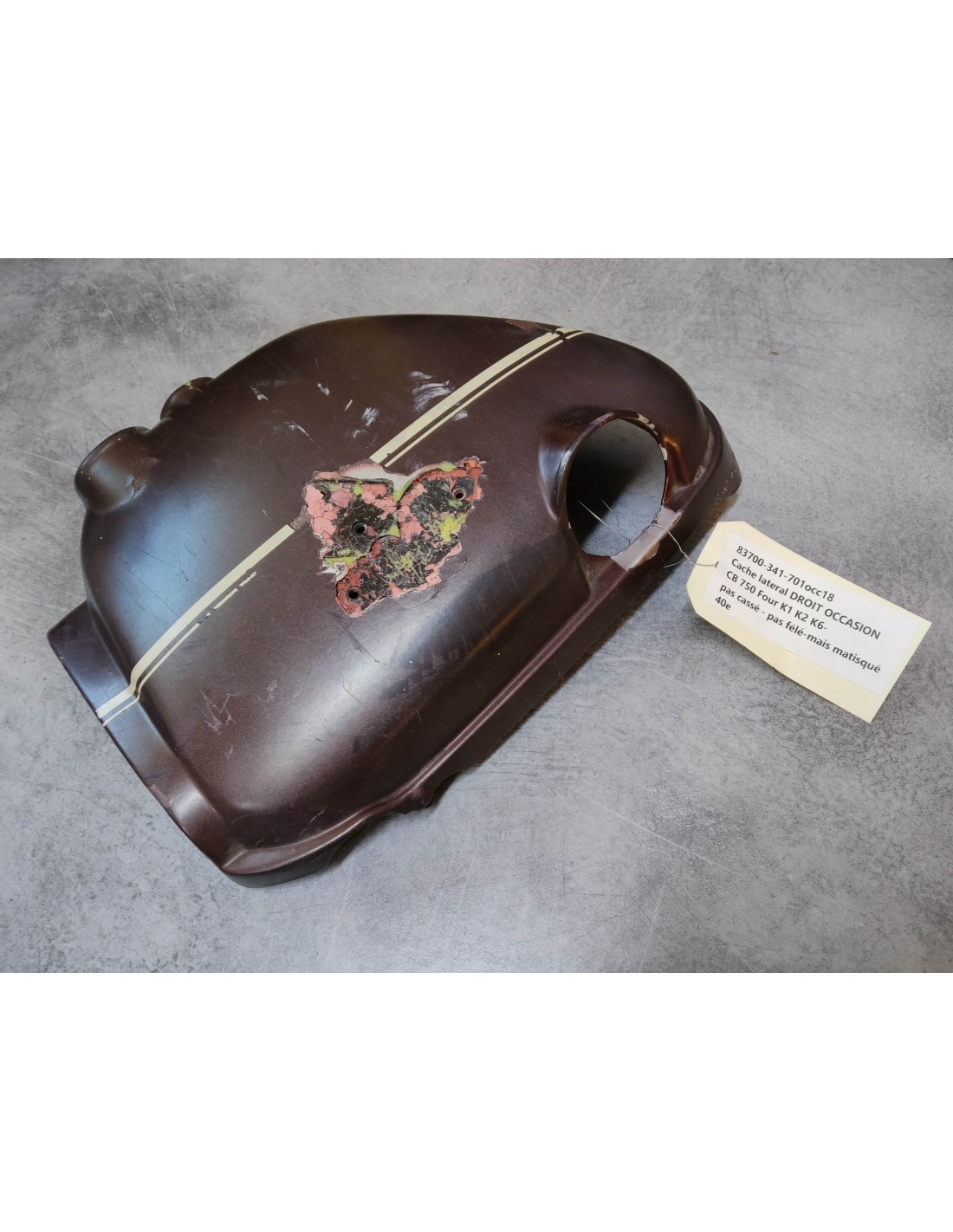 Cache latéral droit occasion CB750 Four K1 K2 K6 HONDA 83700-341-701OCC18 - pièce d'occasion pas cassée ni félée mais mastiquée (voir photos)