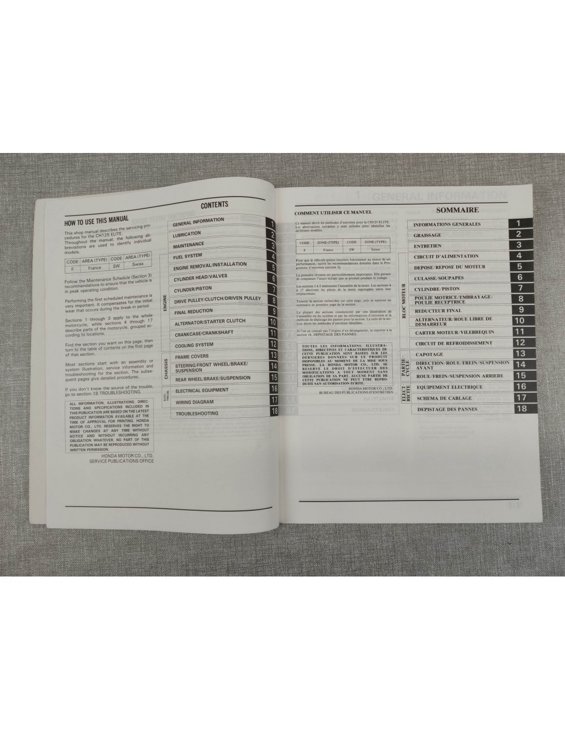 MANUEL D'ATELIER SPACY CH 125 - EDITION 1988 - ORIGINE HONDA 67KV800 67-KV8-00 - TRES BON ETAT