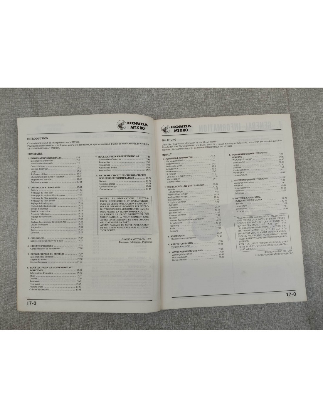 ADDITIF / Manuel d'atelier origine pour les spécificités de la HONDA MTX80 1982 6718300Z en très bon état. En français et en anglais.