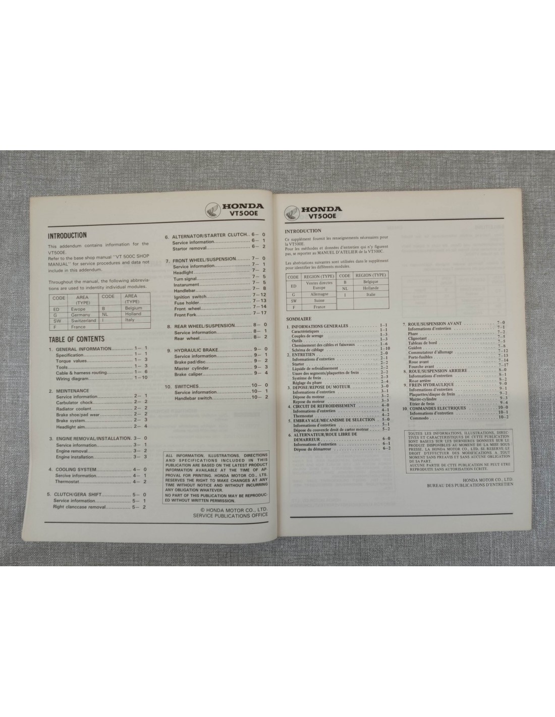 MANUEL D'ATELIER VT 500E ORIGINE HONDA - EDITION 1983 - 67-MF5-00Z 67MF500Z - TRES BON ETAT