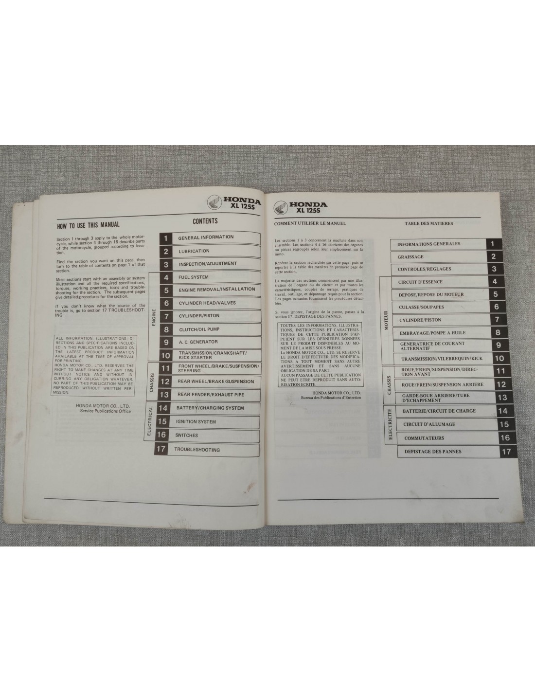 MANUEL D'ATELIER XL 125S ORIGINE HONDA 1978 6643700 66-437-00