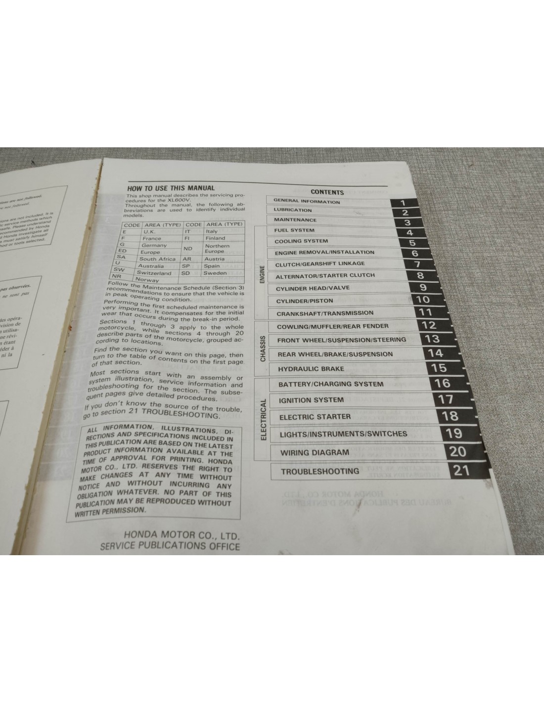 MANUEL D'ATELIER XL600V TRANSALP 87 ORIGINE HONDA 67MM900 67-MM9-00 Coin en bas à droite corné / Bon état.